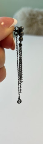 Sort sølv med 3 små kæder foran og en længere kæde bagpå låsen som ender ud i en lille klar sten De er ca 7 cm i alt. De er i super flot stand.