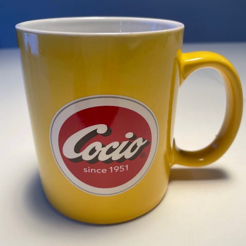 Retro krus i gult porcelæn med Cocio-logo på forsiden og ensfarvet på bagsiden.