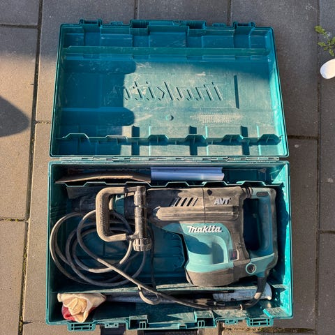 Nedbrydningshammer, Makita, Makita hm1214c 12,3kg, 19,9J vibrationsdæmpende nedbrydnings hammer, beton hammer, betonhammer, kango hammer, kangohammer med flere forskellige dorne/spidser/mejsler 175kr/dag, 350kr/weekend, 600kr/uge Den kan nemt klare nedbrydning af fx kældergulv eller lign