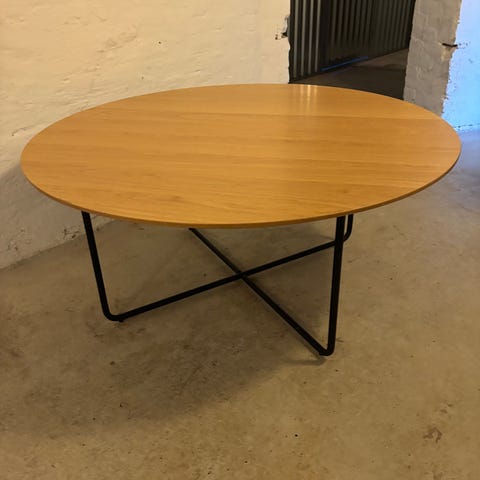 Rundt sofabord med sort træ plade med træets struktur. Har det der hedder forpas fod af stål.
