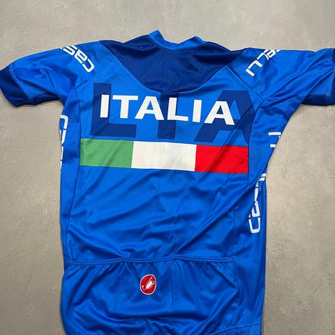Cykeltrøje og handsker fra det mindre italienske cykelhold Batik - Del monte, der i 90'erne både vandt etaper i Tour de France og Post Danmark Rundt, med den italienske sprinter Nicola Minali.