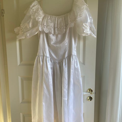 Fin konfirmationskjole. Brugt en gang. Fra ikke-ryger hjem. Ca 68 cm i taljen, længde fra skulder ca 115 cm.