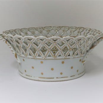 Porcelæn, Gammel frugtskål. , Royal Copenhagen, 2 frugtskål .Frugtskål nr 21/1574 med gennembrudt kant fra ca 1870. Dekoreret med blomster og guldkanter. D: 19 cm. H: 8 cm. Rundt fad 21/1556, d: 26 cm. Pris med sæt skål og fad. Pris frugtskål og underfad: 2550. Kan sendes efter aftale