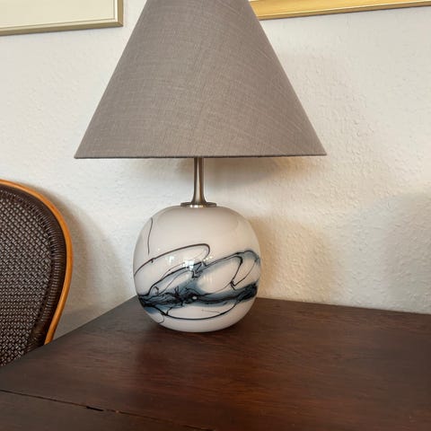 Designet af Michael Bang for Holmegaard. Fin stand, men en ny lampeskærm ville nok pynte. Diameter på selve glasdelen af lampen er ca. 16 cm., af skærmen ca. 30 cm. Højde af selve glasdelen ca. 20 cm., højde inkl. fatning og skærm i alt ca. 40 cm.
