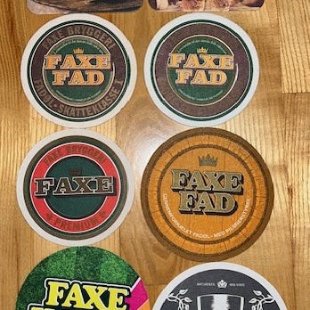 Gamle ubrugte øl-brikker med Faxe Fad tryk på den ene side.