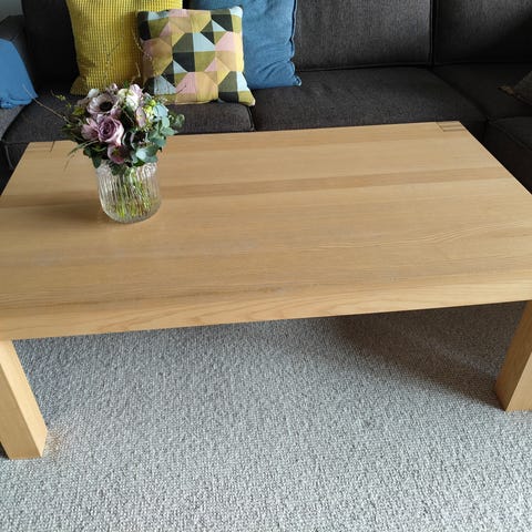 Helt nyt sofabord i lys eg og sort stellet. Der mangler skruer. Står stadig i kasserne. Nypris er 2.599kr.