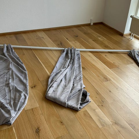 Inkl. 3 stk. ophæng og inkl. 24 stk. gardinringe (se foto. NB - nypris for 1 stk. gardinring er kr. 9,-):