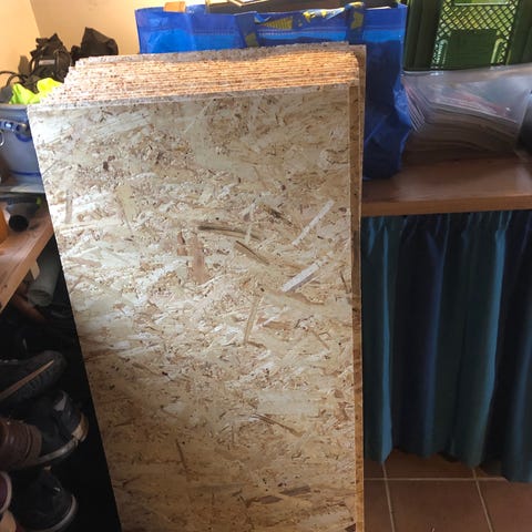 OSB Plader ca. LxB 120x80 cm 10 mm . Stykpris 50,- kr.