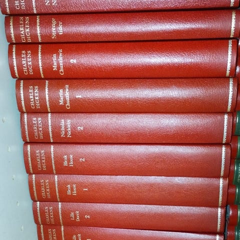 Bindene burde indeholde Little Dorrit, Oliver Twist og ydeligere nogle værker, når jeg ser på de bind, jeg har.