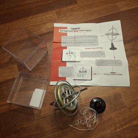 Legetøj, Gyroskop USA, Amerikansk produceret gyroskop fra sidst i 40erne de laves stadig og er sjove og lærerige i forhold til tyngdekraften, dette er specielt på grund af den originale emballage fuld funktionsdygtig og videoer på youtube om hvordan det virker