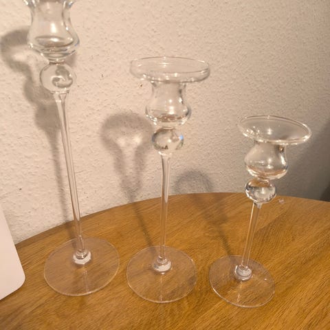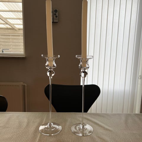 Holmegaard åkande fyrfadslys/lysestager i krystalglas, to store, en lille