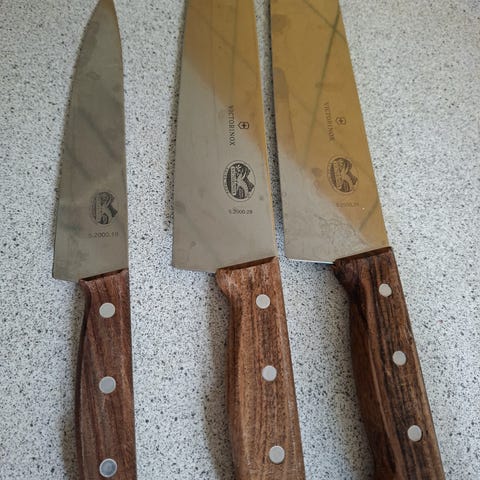3 kokke knive. Skal formentlig lige slibes. Men så har du også nogle rigtig gode knive. Kommer fra professionel kok der har ryddet op.