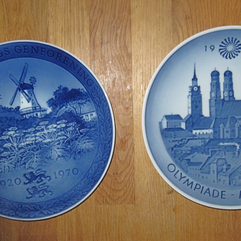 Dette er en dekorativ mindeplatte fremstillet i anledning af Olympiaden i München i 1972. Platten har en motiv af Olympiaparken i München med årstallet 1972, afbildet i blå nuancer på en hvid porcelænsbaggrund. På bagsiden er der producents mærkning for Royal Copenhagen.