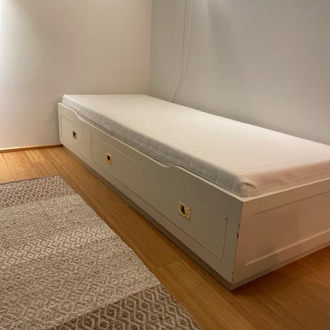 Retro skibsbriks med 2 lige store skuffer under - skufferne har messing håndtag, som alle er intakte - sengen har høj gavl og ryg - madressen har orginal betræk i blå fløjl - Smuk gammel skibsbriks velholdt og fin - pris for skibsbriksen kr 2.250,-.. Matcher blå retro kuglelampe, der er til salg på anden annonce - se evt denne - SAMLET PRIS FOR SKIBSBRIKS OG BLÅ KUGLELAMPE KR. 2.550,- afhentet.