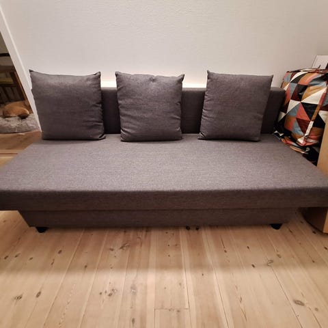 JYSK Norsminde, 3-personers sofa i stof. Sofaen kan nemt laves om til en seng. Sæde- og ryghynder i skum. Med opbevaringsplads. Udslået liggemål 130x192 cm. B192 x H83 x D83 cm. Nypris 2800 kr. Kan evt leveres.