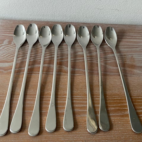 Hardanger bestik: Æske med 6 lange caffe latte (eller isdessert) skeer i rustfrit stål. Øverste del er mat mens resten er blank. Stemplet Hardanger 18/8 på bagsiden. En ske måler ca 20cm. Har aldrig været brugt.
