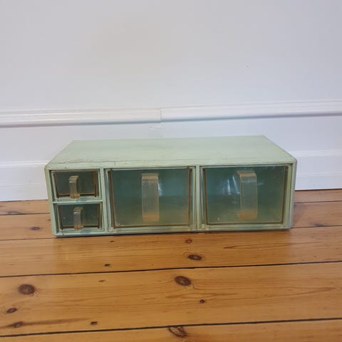 Sjovt gammels svensk “vægreol” i stof med fire rum. Oprindelig beregnet til køkkenet, men kan også bruges andre steder. Har 2 messing æsker til at hænge op i. Måler 43x34 - lette brugsspor men i generelt pæn.