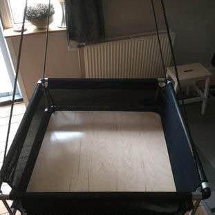 Rigtig fin med høje kanter. Vi har lavet en plade og madras til . Som kan følge med. Stellet er alu og sort net. Sorte reb og ophæng der gør den ikke snor sig.