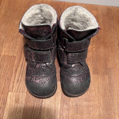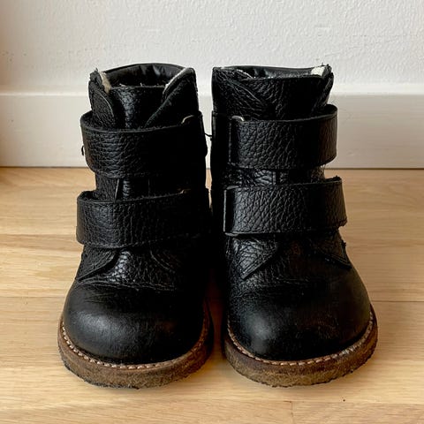 Angelus støvler str. 22 ( evt str. 23 måler ca 15 cm indvendig. Er i tvivl om størrelsen ) Mørke Røde med guld på siden, hjerte på forstykket .. kun brugt til alm brug ikke til beskidt leg på legeplads eller brugt til børnehave . ( kun pæn brug) der mange gå ture endnu i dem.. pæne god støtte til de små fødder , har dog en lille rids/ afskrabning på den ene snude . (Se billede )