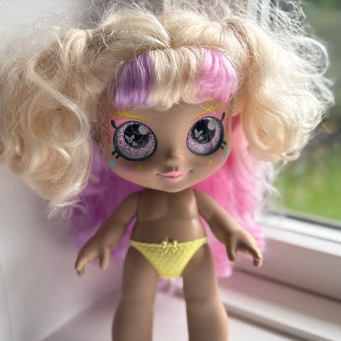 Rigtig sød dukke med store funklende øjne, der næsten ikke er brugt. Den har let bevægelig hoved og kan bevæge arme og ben. Kan sidde selv. Der medfølger en kjole, billed 3.