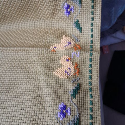 Håndbroderet påskeløber i lys grøn med broderede påskeliljer og kyllinger ca 60x25 cm.