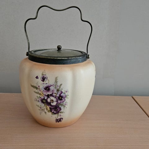 Kiksspand, Keramik, Antik eller vintage kiksspand fra Stratford, made in England og et nummer 429. Art deco. Diameter 12 cm, højde med låg ca. 8,5 cm og med hank 14 cm.