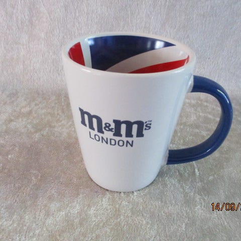 Fantastisk kop med en brunlig M&M figur, der bliver blå når der kommer varmt i koppen.