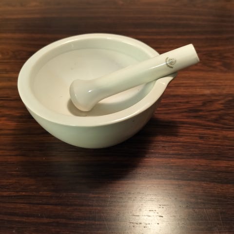 11,5 cm høj. Diameter top: 12,5 cm. Diameter bund: 8 cm. Støder 20,5 cm lang.