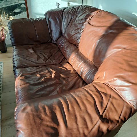 Sofa i lyst læder med træben. Sofaen har to ryglænspuder og to sædepuder. Designet med armlæn og ben i træ. Sofaen er velegnet til opholdsstue eller andre opholdsområder.