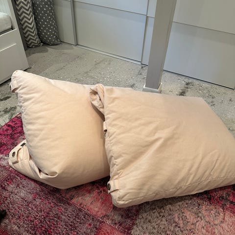 Sort sækkepude købt i biva 90 x 120 cm og sort rumopdeler fra Ikea til loft ophængning 30 cm i diameter og 180 cm lang.