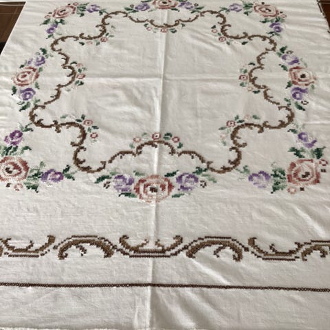 DUG håndbroderet, sjælden flot kvalitet ca 110x110, gammel , hel og fin - se fotos. De yndigste farver. fast pris. Sender gerne på købers regning