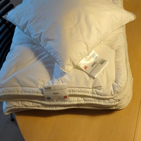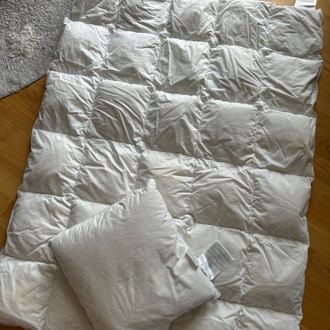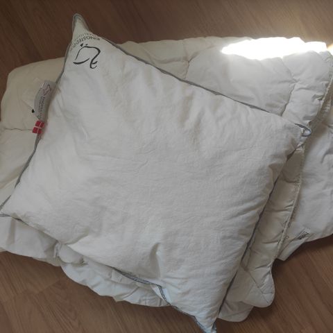 Et flot dyne og pude sæt af mærket Høie. Str. 100x140 cm, meget lidt brugt, da det har været som ekstra hos bedsteforældre. Fra røg, dyre og parfumefrit hjem.