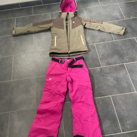 Rigtig fint ski sæt str S. Hvide bukser med seler og bordu jakke. Brugt få gange og fejler intet. I der jakken kan lynes af.