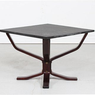 Sofabord af skiferplade med stel af formspændt, brunbejset træ og cirkulær plade af sort skifer.