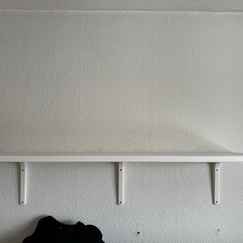 Hvidmalede hyldegavle og tre hylder i egetræslaminat