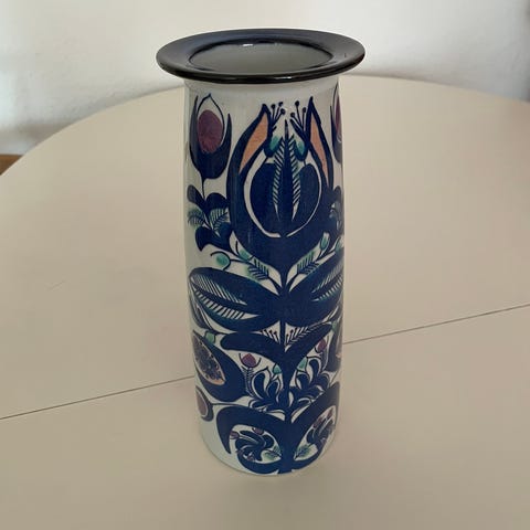 Elegant og iøjnefaldende rubinrød vase i tolags glas, med en karakteristisk plansleben kant, der giver et skarpt og raffineret udtryk. Vasen måler 19 cm i højden og fremstår i en dyb, mættet rubinrød farve, som er typisk for kunstglas fra midten af det 20. århundrede. Den er udført i tolags glas, hvilket betyder, at farven er indkapslet mellem to lag klart glas – en teknik der giver dybde og glans til farven.