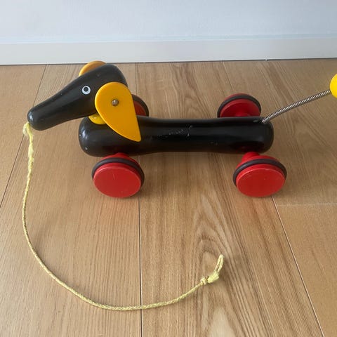 Flot gravhund til at trække rundt med. Kroppen har 3 led. Massivt træ. Ører der hænger frit. Gaven til alle gravhundeelskere, som jeg selv.