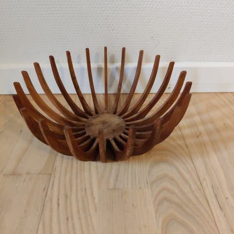 Serveringsskål i hvidt porcelæn/keramik fra Trip Trap, der nu hedder Skagarak. Jeg er desværre ikke klar over, hvilken træsort, der er tale om.