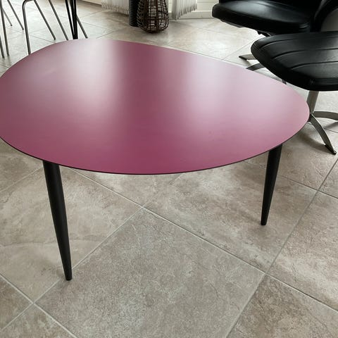 Bordet har fire elegante, tilspidsede ben i mørkt træ.