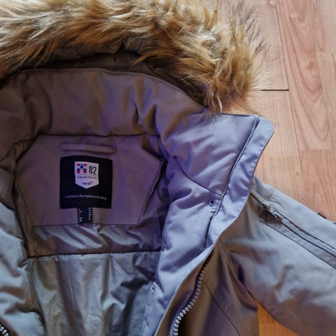 Superflot ridejakke fra Horze i mørkeblå, mange detaljer. Desværre blevet for lille. Jakken er meget varm. Der medfølger pels på hætten, som kan knappes på.
