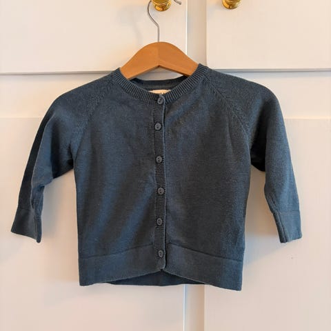 Fin blå cardigan fra MarMar størrelse 10-11 år. Perlemors knapper. Den nederste mangler (det er ikke noget man lægger mærke til) og der er lidt diskret vaskefnuller hvorfor den sælges billigt. Røg og dyrefrit hjem. Kan evt sendes med Dao.
