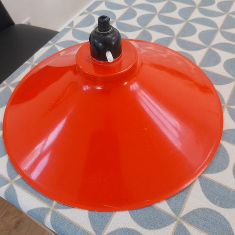 Lampeskærm, metal, denne lampeskærm er fra 50 - 60 erne. den kan med lidt håndsnille og en ny fatning blive en fin lampe. men da fatning mangler sælges den for bare 25 kr