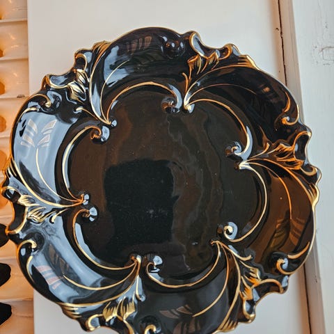 Serveringsfad i ægte Kobalt med bladguld. B 16 cm, l 19 cm, højde t. hank 5 cm.
