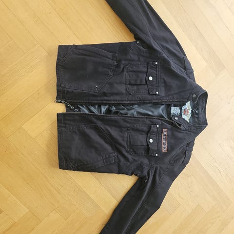Flot Harley Davidson jakke, str. L. Jakken er uden sikkerhed - en tyndere version - fritid eller på træf. Logo, navn mv er syet på. Brugt ganske få gange. Er som ny. 600 kr. Er i Ebeltoft, kan medtages til Aarhus. Sender gerne. Fra røg- og dyrefrit hjem.