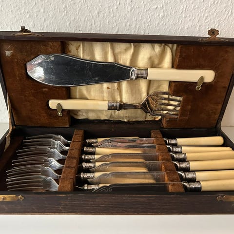 Flot fiskebestik med lyst skaft i trækasse, rigtig flot sæt til 6 personer. Sælges for 400 kr.
