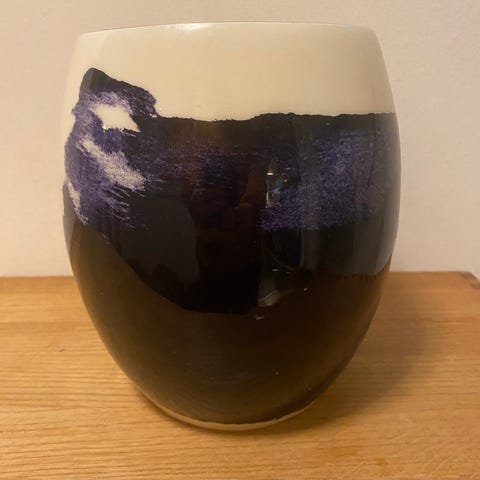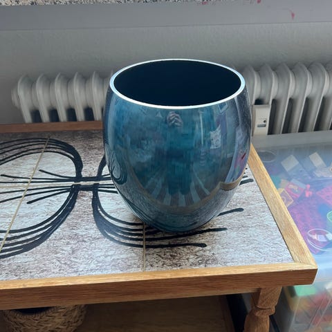 Har en helt lys gulig farve med det mørkeblå abstrakte motiv.
