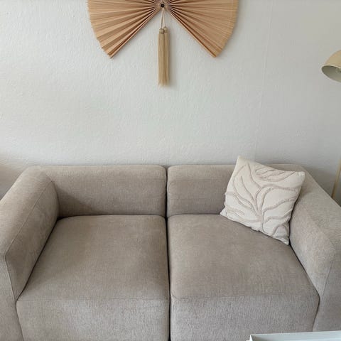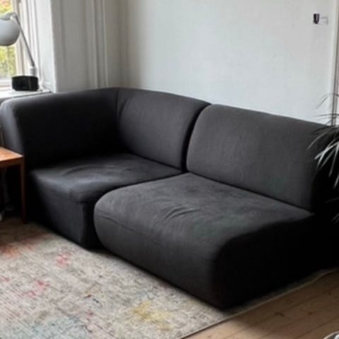 4 år gammel og er brugt. Fungerer fint men har lidt blamager i stoffet som formentlig kan renses ellers vaskes med klud. Har synlig fordybning mellem de to moduler hvor der er blevet siddet og ligget.