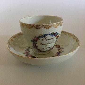 Stand. Flot, har slidtage på guldkanten indvendig på koppen. Øret er ikke originalt. Men erstattet af nyt flot øre i bedste still, som passer flot til koppen.