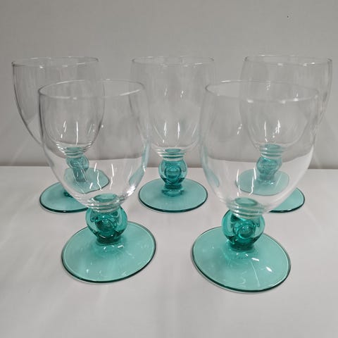 Smukkeste vinglas med grøn/brunlig fod. De er formentlig fra franske Luminarc. Der er de her. 6 stk. De er i rigtig fin stand, et enkelt lille nip i kanten på et enkelt glas. Men så lille at det ikke ses.