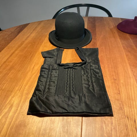 Sort bowlerhat, ca. 55 cm i diameter. Filt-agtigt stof. Med ansigt - øjne, ører, næse og glad mund. F.eks. klovnehat. I rigtig fin stand. Evt. til festtema, fastelavn, udklædning, nytår eller lignende. Fra ikke ryger hjem. Afhentet eller plus 58 kr. til forpakning og forsendelse med tracking. Sender straks ved betaling og så er den forventeligt fremme i løbet af 1-3 dage med tracking.